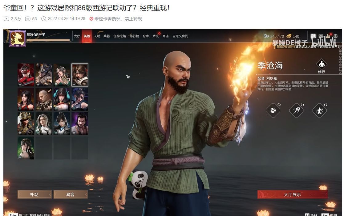 據小編一番了解后發現,其實這段視頻并非真正的《西游記》花絮,而是粉絲利用最近大熱的國產武俠競技游戲《永劫無間》中,堪比黑科技的捏臉玩法,完美復刻了86版的唐僧、孫悟空、豬八戒和沙僧四人的樣貌,才讓網友誤以為是原班人馬再現。
