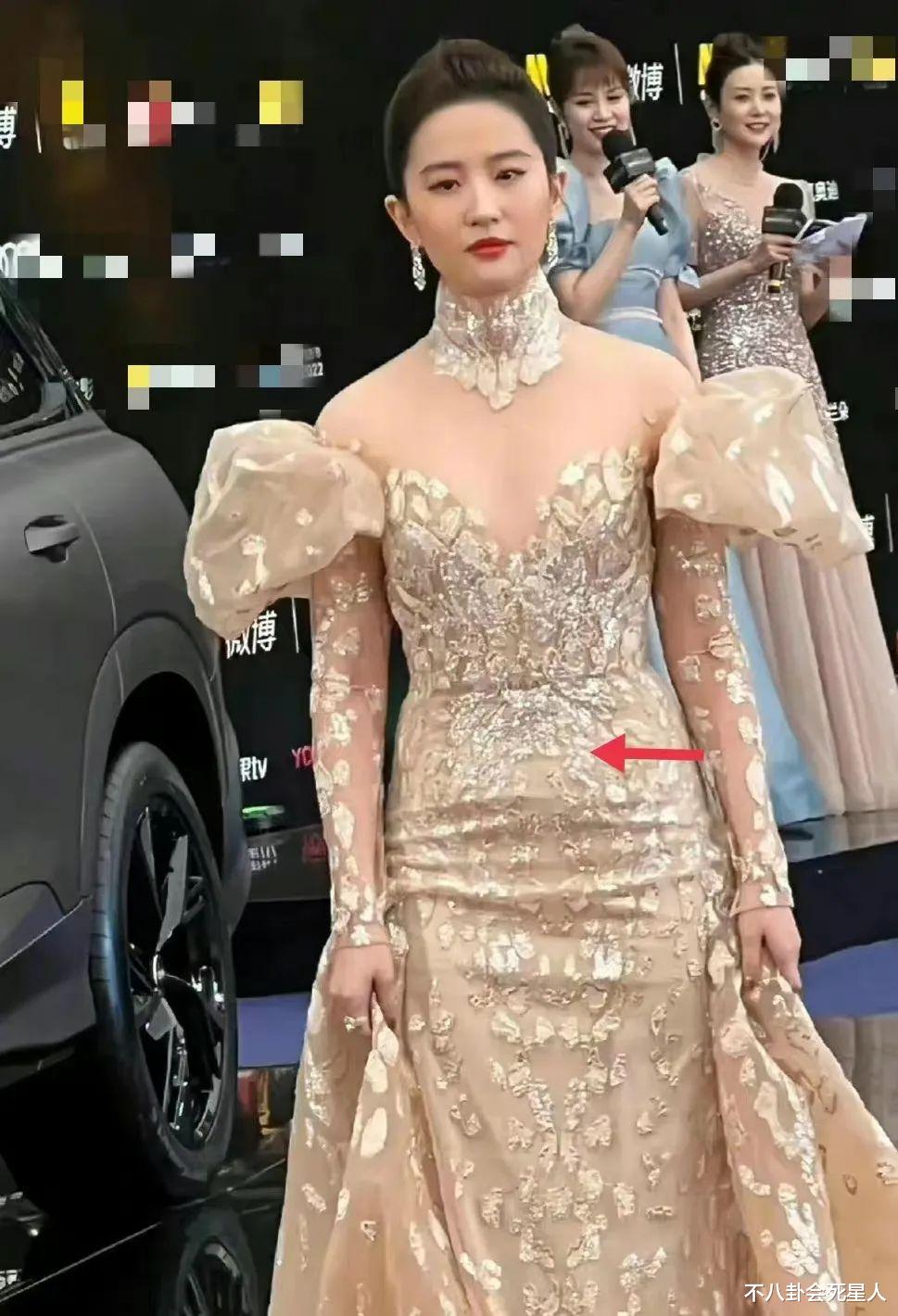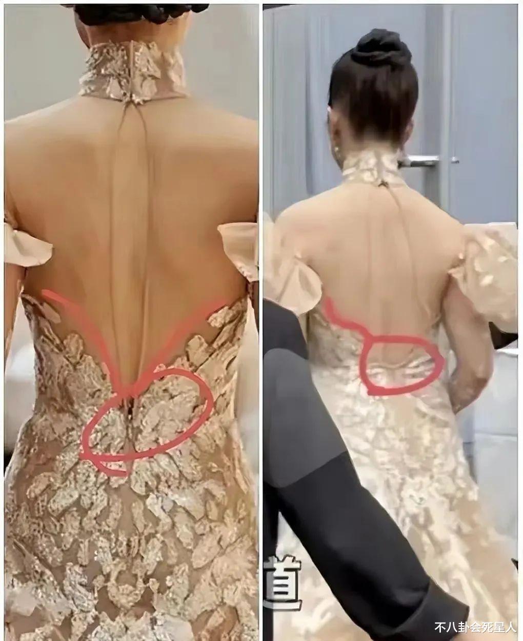 更尷尬的是,明明是同一件衣服,模特穿起來苗條勻稱,而劉亦菲體型有些臃腫,背部寬厚,連拉鏈都拉不上。