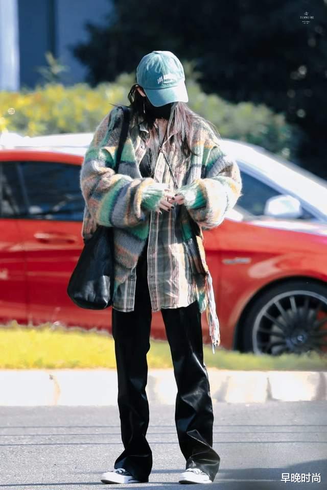 彩色開衫楊冪穿過不止一次,綠色和紫色為主的開衫沒那么扎眼出彩,透著滿滿的溫柔和甜美。但楊冪搭配了皮褲,所以變得酷帥很多,甜酷風真是穿不膩。還疊穿了綠色襯衫,這個同色系穿法很是巧妙,真是太會穿了。