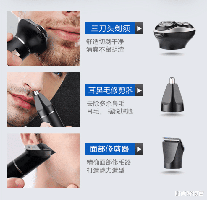 楊子三合一套裝還有一個特別大的亮點,取下理發器刀頭,就能秒變剃須刀,取下剃須刀刀頭,就能秒變鼻毛修剪器,買了這款三合一套裝,相當于擁有理發器+剃須刀+鼻毛修剪器。