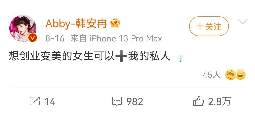 一邊教女孩子一定要先愛自己,一邊整容賣丑、三進三出民政局,雙標是被她玩得明明白白。這次離婚后,熱度飛升,韓安冉也是趁勢打廣告:“想創業的變美的女生可以加我。”
