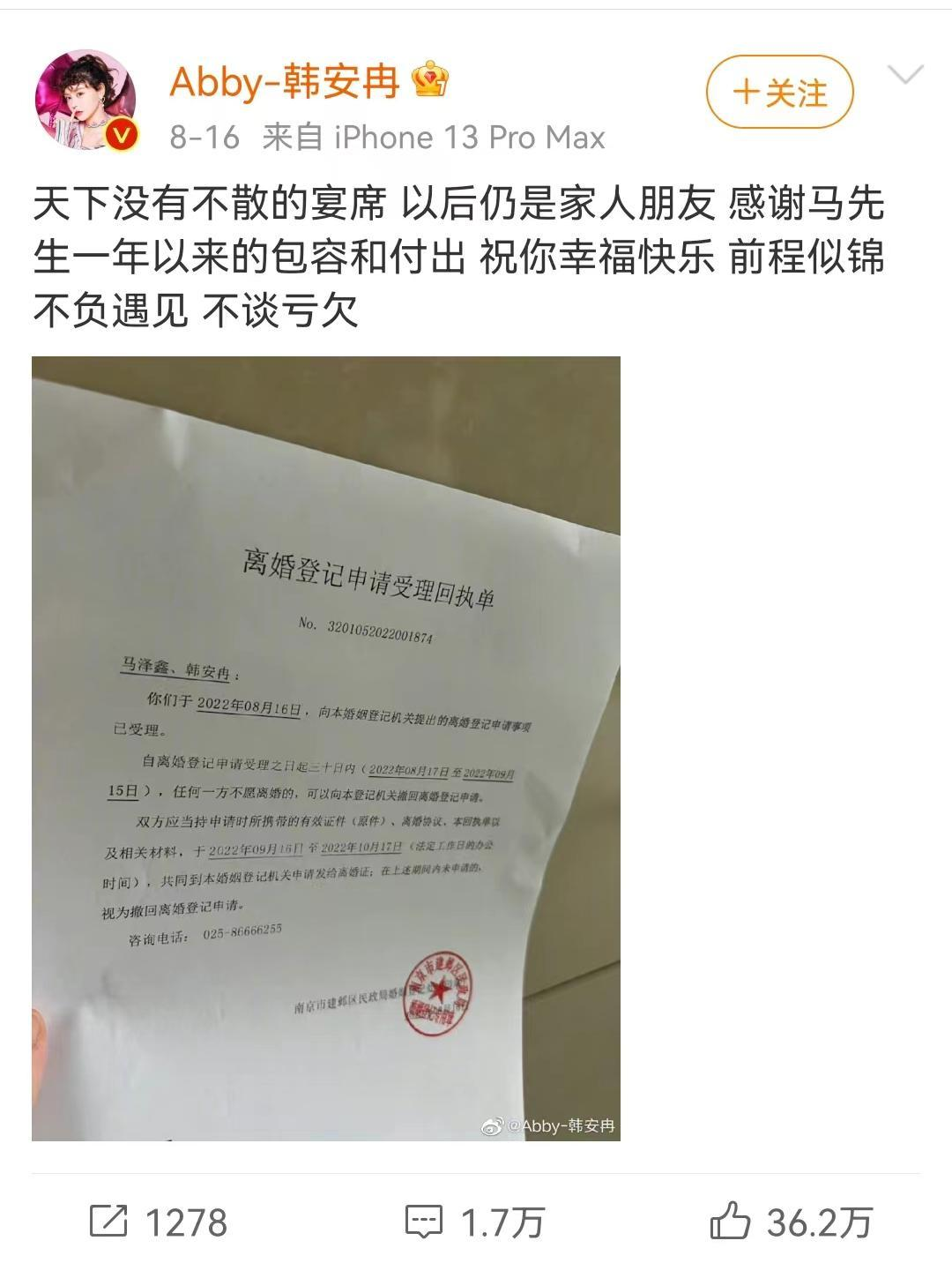 這期間,同樣的劇情不想再贅述,不是出軌就是互罵,分分合合像筆扒不完的爛賬。前天,韓安冉三婚三離成就達成。