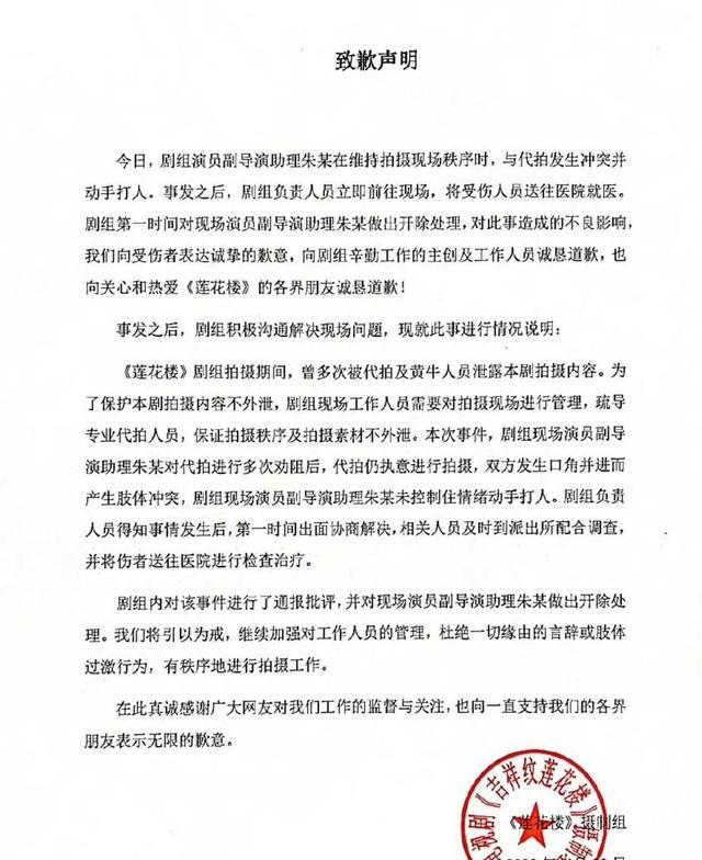 致歉內(nèi)容分為三部分:其一,解釋清楚事情經(jīng)過,代拍干擾秩序在前,打人在后,但無(wú)論如何動(dòng)手都是不對(duì)的;其二,打人者是副導(dǎo)演助理朱某,目前已作開除處理;其三,向受傷者表達(dá)誠(chéng)摯的歉意,對(duì)主創(chuàng)人員進(jìn)行道歉,也對(duì)觀眾《蓮花樓》的朋友們誠(chéng)懇道歉,會(huì)加強(qiáng)管理,讓各位擔(dān)心了。