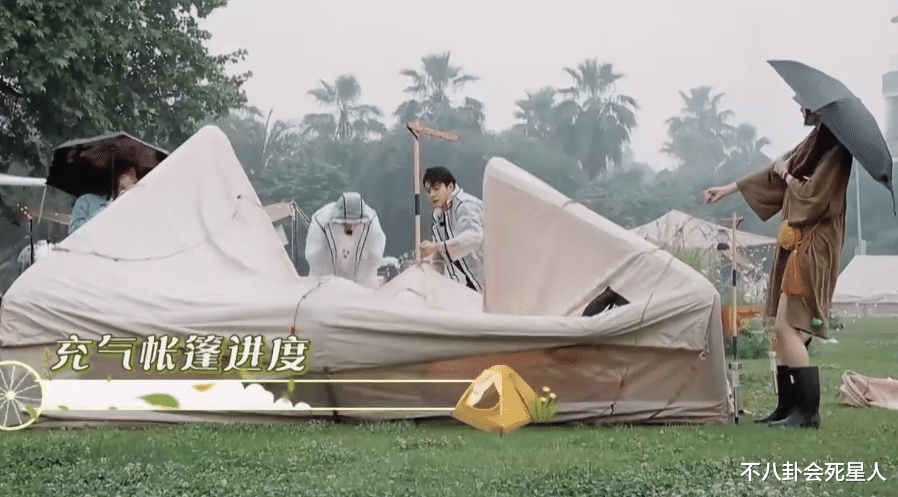 明星們在保姆式服務里,象征性地實踐下,就能感動自己了。比如在大雨里不選擇先避雨,寧愿打著傘也要冒雨搭帳篷,喊著雞湯口號就當是突破了自己。
