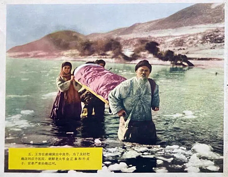 還有朝鮮金貞泰老大爺,在影片開頭呼喊群眾幫忙把受阻的汽車抬出去,在影片結尾頂著敵軍的炮火,趟過冰河,將王芳安全的送進后方醫院。