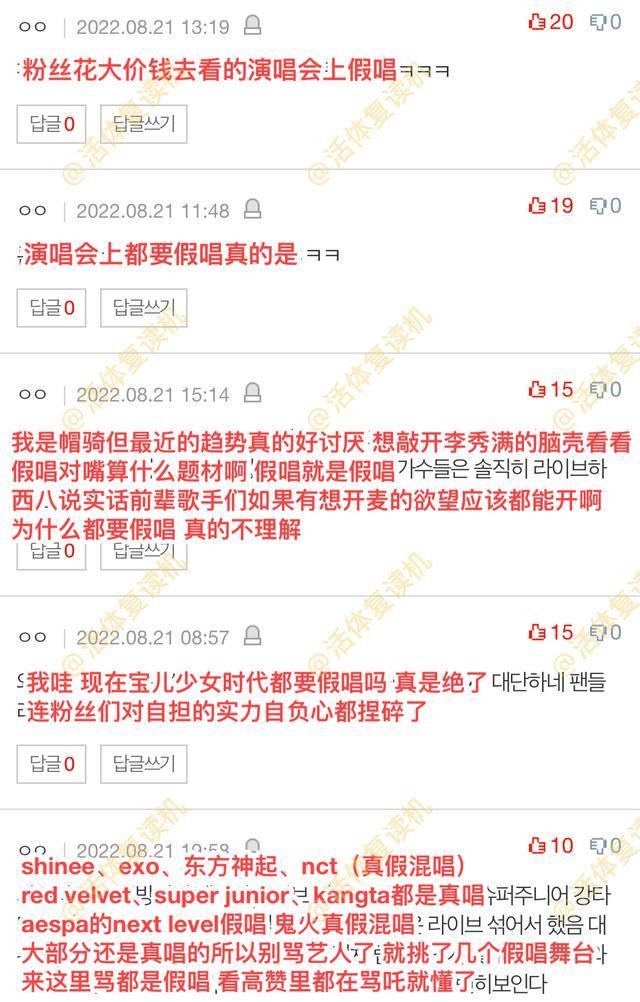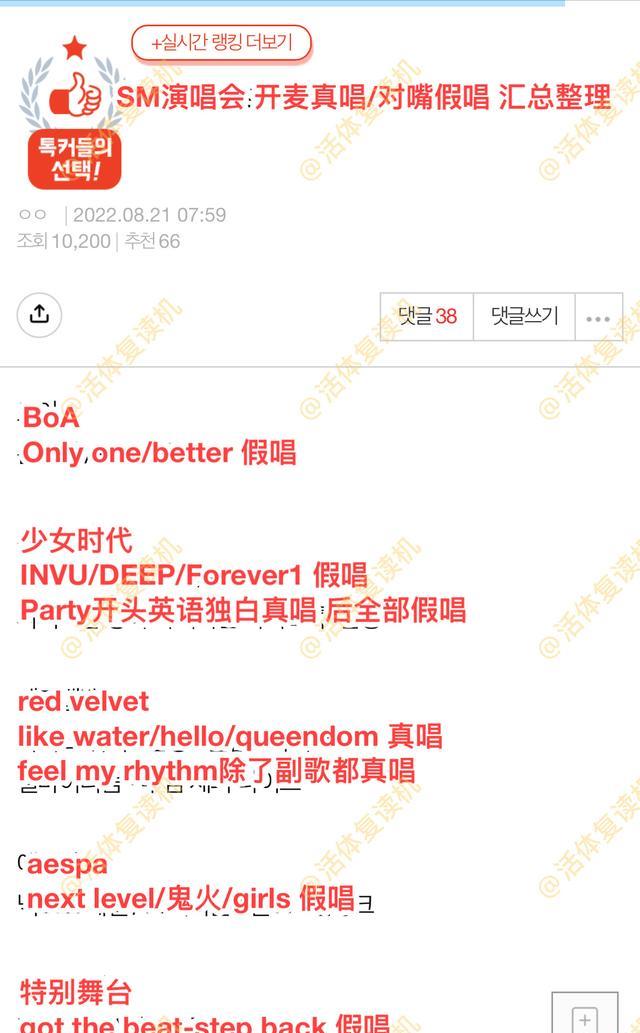韓媒公開了SM家族演唱會的假唱情況,其中aespa的《next level》,《怪火》和《Girls》,少女時代的《INVU》,《DEEP》,《DOREVER1》和《Part》全都是對嘴假唱,這兩個組合未能在此次演唱會帶來哪怕一個完整的唱跳舞臺,當然像BOA的情況也差不多,她的《only one》和《better》也都是對嘴假唱。