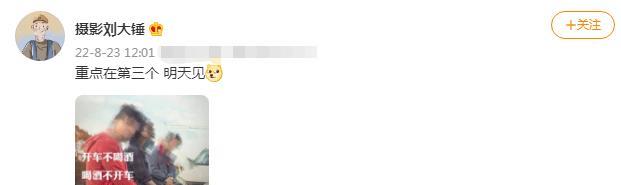 只見劉大錘發布了一張打碼的照片,將圖中3個人物的肖像抹去了,并且在圖片上寫了一段:“開車不喝酒,喝酒不開車,中年代駕男團,你的暢飲好朋友”。