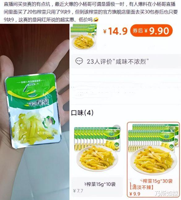 近日,有網友在社交平臺上表示,小楊哥直播間中所出售的榨菜要高出日常價。在小楊哥的直播間中,20包榨菜僅售9.9,但是官網中同樣的價格卻能買30包,對此,網友也紛紛感嘆自己上當了。