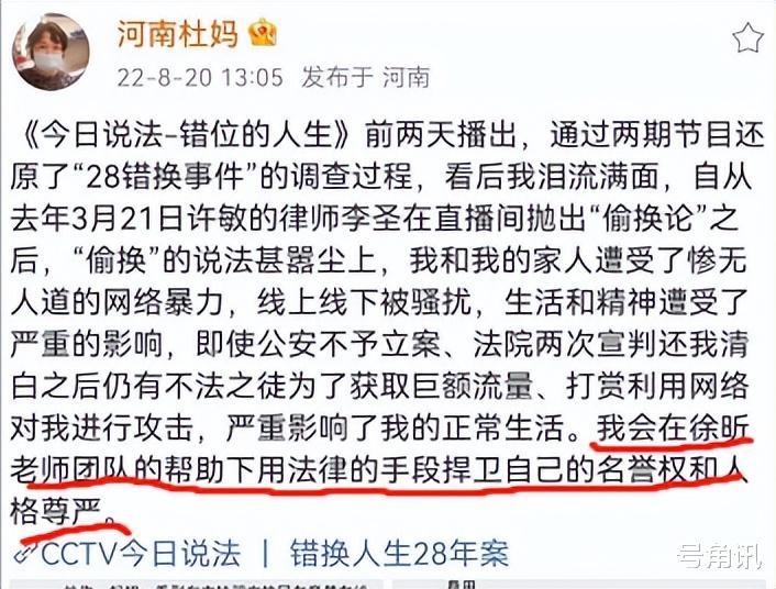 昨天看到杜媽發了微博,除了感謝央視《今日說法》欄目感謝廣大網友外,說到了在徐昕老師團隊的幫助下用法律的手段捍衛自己的名譽權和人格尊嚴。