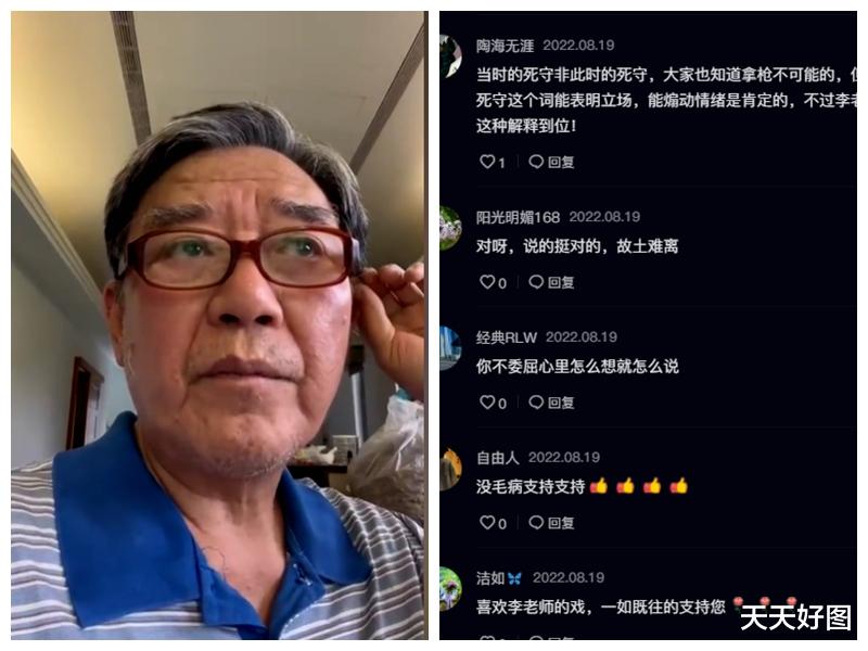 萬一有一天戰亂,“我們是一批死 守 臺W”的人。這個“死守”的意思,不是到時候我還拿q,我連拿棍都拿不動,“我的意思是說死守故土,不會將房子賣了,抱著錢移民,不會,我會和老婆一起老死在臺灣”。今天稍微緩一點了,那么大年紀了,我自已委屈沒事,但該解釋還是要解釋,沒關系的。