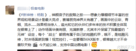 有網友評價得很中肯,他的評論前半段是夸電影“追光的制作非常精良,充滿了豐富的想象力,很多場景比如太極圖美輪美奐,相比之下故事完整豐富?!钡蔡袅艘恍╇娪暗拿。J為電影想講的太多鋪得太滿,又要為追光的封神宇宙鋪陳導致很多伏筆草草了事,而楊戩則像是穿針引線的工具人,性格與命運是模糊的。