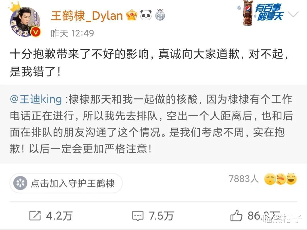 明星一紅就容易招黑,王鶴棣因為讓助理代排做核酸被罵了,他立馬發微博道歉,別人道歉都是“無意占用公共資源”等文案,王鶴棣的是:“對不起,是我錯了!”