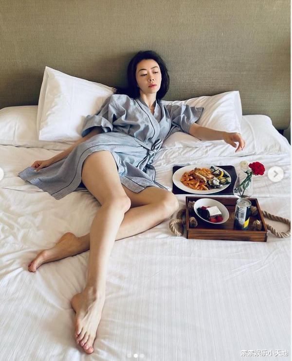 人家隔離不是秀生活,反倒熊黛林則是自己專(zhuān)業(yè)工作的理念秀出自己的模特身材。躺在床上穿著浴袍的她與自己的美食午餐幸福合影。