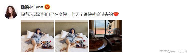 8月19日,熊黛林分享自己在某豪華酒店內(nèi)隔離的照片。熊黛林:隔著玻璃幻想自己在度假,7天?很快就會(huì)過(guò)去的!