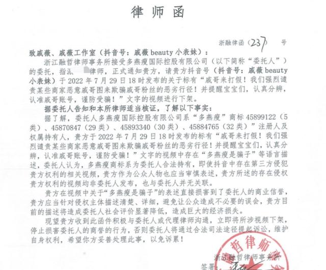 此后,該品牌沒有再發聲,也沒有“專門”向戚薇道歉,原本以為他們是打算避而不談,結果隔了幾天之后,戚薇以及戚薇工作室收到了一封律師函,這個品牌方居然反過來把戚薇給告了,稱戚薇損害了該品牌的商業信譽。