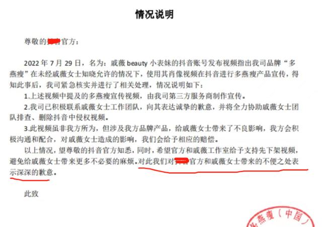 為了不讓更多粉絲上當,戚薇在發現這件事之后,聯系了對方,然后還專門發了一個打假視頻提醒粉絲。該品牌得知這個消息之后,并沒有聯系戚薇,而是先給短視頻平臺的官方發了一封情況說明書,承認了自己錯誤,希望官方配合刪除視頻,同時也向戚薇道歉。