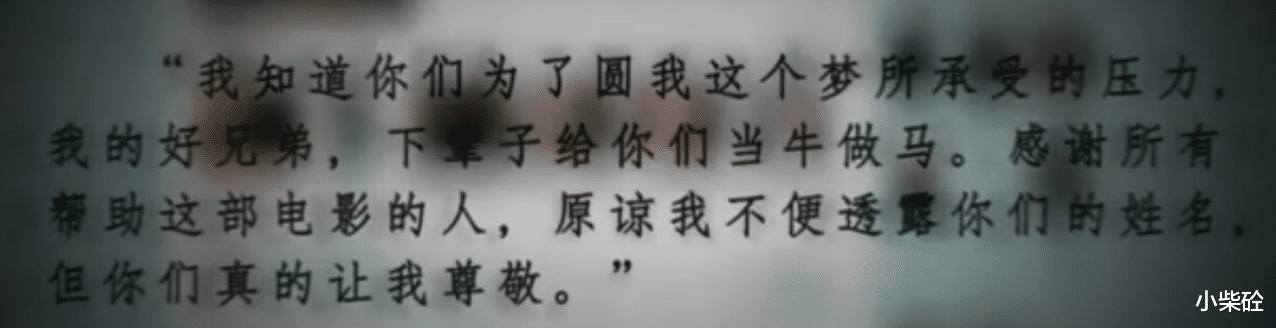 “我知道你們?yōu)榱藞A我這個夢所承受的壓力,我的好兄弟,下輩子給你們當(dāng)牛做馬。感謝幫助這部電影的人,原諒我不愿透露你們的姓名,但你們真的值得我去尊敬。”