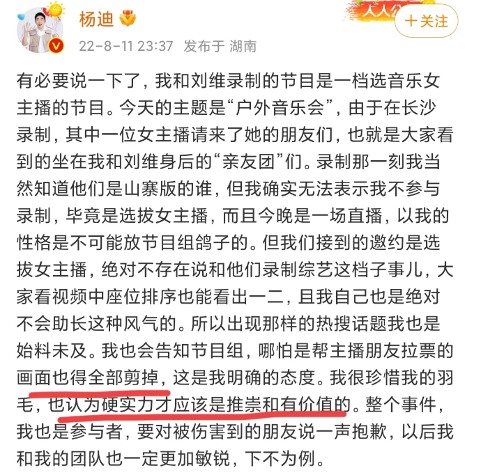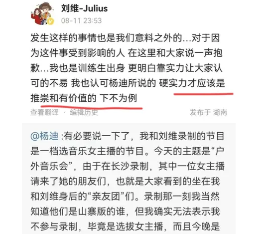 楊迪和劉維也受到了牽連,被眾人指責,為此楊迪還專門發文道歉,表明自己并沒有跟鹿哈一些錄節目,是eso不請自來,被一位女主播邀請上臺的,并明確表明之后會刪減掉有eso的片段!