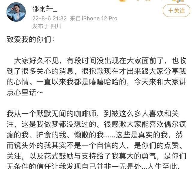 在其官方賬號上,一直以來從不出鏡的張小花以她的口吻寫了一封分手信,向粉絲講述了兩人的心路歷程:邵雨軒想要換一種生活,兩人彼此尊重,并和平“分手”。4000萬粉絲的賬號交給張小花打理,邵雨軒則重開了個人號。