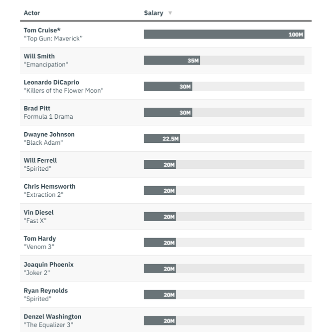 好萊塢最新片酬榜,湯姆·克魯斯憑借《壯志凌云2》的1億美元登頂