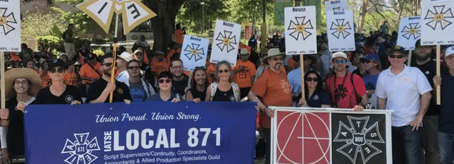 好萊塢工會影響力很大,右邊旗幟上的2個圖案是好萊塢兩個最大的工會標(biāo)志