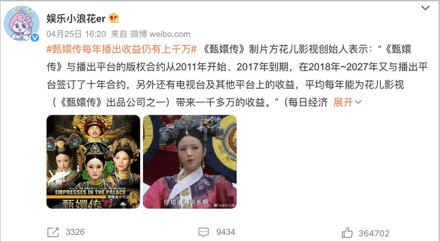 花兒影視的創(chuàng)始人敦勇曾在采訪中說,每年《甄嬛傳》播出至少還能給花兒影視帶來1000萬的收益。