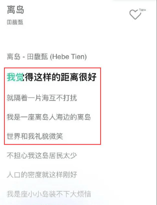 不僅如此,在其創(chuàng)作的歌曲作品中,有一首歌名叫《離島》,其中的歌詞也暗含田馥甄不支持統(tǒng)一的立場,在歌曲中,田馥甄叫囂,“我覺得這樣的(臺灣和大陸)距離很好,相隔一片海互不打擾”