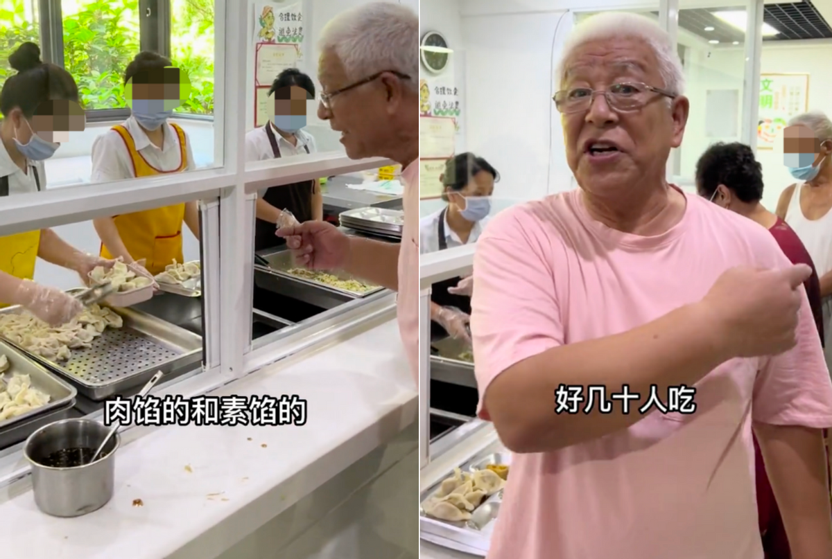 在領餃子之際,張洪杰熱情和后廚人員交流,詢問餃子都有什么餡,每人是不是限定領取。最后得知葷素都有,而且餃子個個都是后廚人員親手包的,連連感嘆此舉非常好,很多老人都在這里吃。
