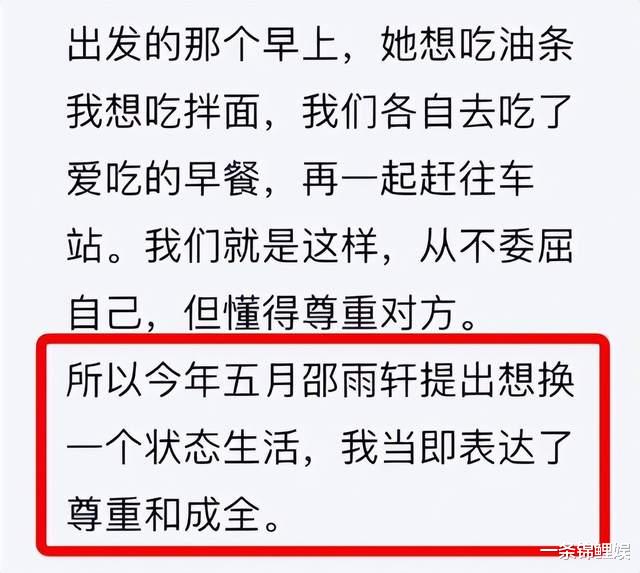 只是,很多人都忽略了一點(diǎn),兩個(gè)人的初心并不是為了賺錢,而是為了給觀眾帶來(lái)歡樂(lè),也是為了體現(xiàn)兩個(gè)人的個(gè)人價(jià)值,至于賺錢,相當(dāng)于額外的附加值。這也是兩個(gè)人可以做到分開(kāi)不撕逼的主要原因之一。邵雨軒在文中也提到,是自己先有了想換一種生活方式的念頭,還表示自己的狀態(tài)一直都在走下坡路,失去了那份開(kāi)心和快樂(lè);這就是邵雨軒和張小花分開(kāi)的真正原因。
