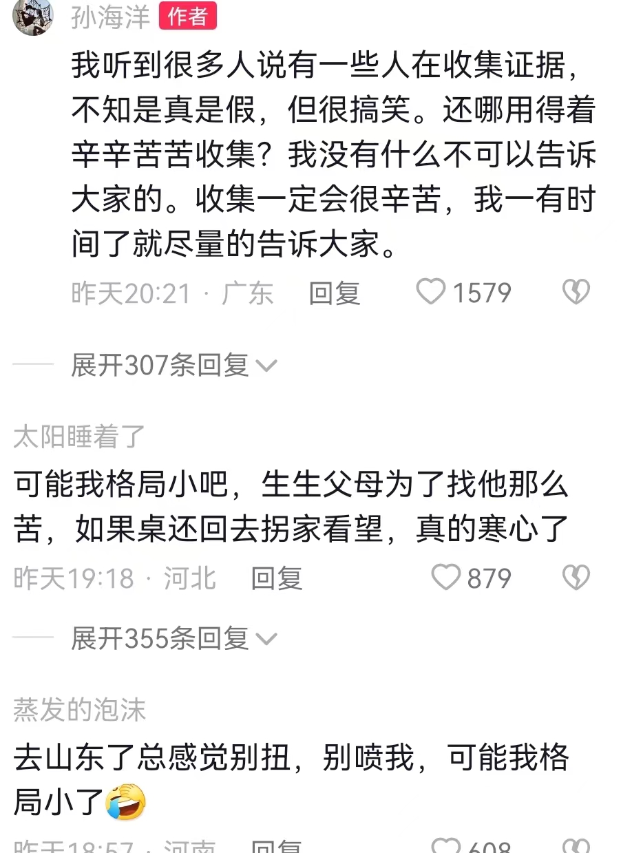 可不知道為什么,網(wǎng)絡(luò)上卻有一些聲音說收集到了不少的證據(jù),認(rèn)為孫卓是去山東玩了,這也是使得孫海洋不得不去回應(yīng)一下這個話題。孫卓曾被拐到山東陽谷,這回到山東玩耍總覺得有一些不舒服!