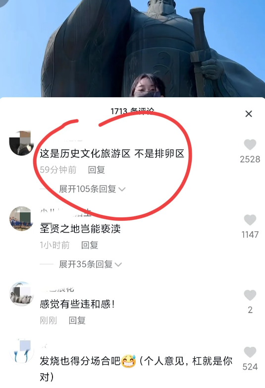 網紅橙子的這一舉動惹怒了不少網友,評論區一片吐槽之聲,有人覺得圣賢之地豈能褻瀆,有人覺得有些違和,還有人直接吐槽這是歷史文化旅游區,不是排卵區!網友們說得很直接,但也是基于網紅橙子的過分行為,才會激怒眾人,網紅為了流量做一些吸引眼球的舉動,我們是可以理解的,但不要為了流量而違反道德,這會帶來極壞的影響!最后,希望大家不要沉迷于“玩擦邊”的美女網紅們,多關注生活細節,她們都是為了利罷了!