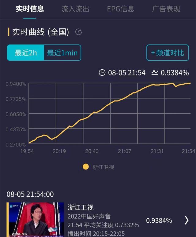 8月5日晚間,2022年《中國好聲音》首期,在浙江衛視播出。不出所料,首期節目收視率迅速躥升。根據酷云實時的收視率數據來看,《中國好聲音》的開局收視率只有0.3%前后,而節目播出之后,收視率一路看漲,最終穩定在了0.9%以上。這樣的收視率成績,讓《中國好聲音》迅速成為衛視實時收視率的第一。