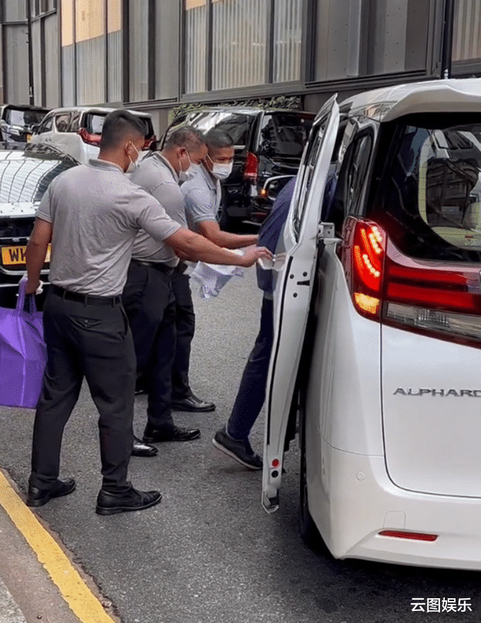 只見其中一位保鏢將毛巾搭在手臂上,攙扶著他上了一輛白色的豪車。另外兩個保鏢則在身后護著他,生怕他不小心跌倒。