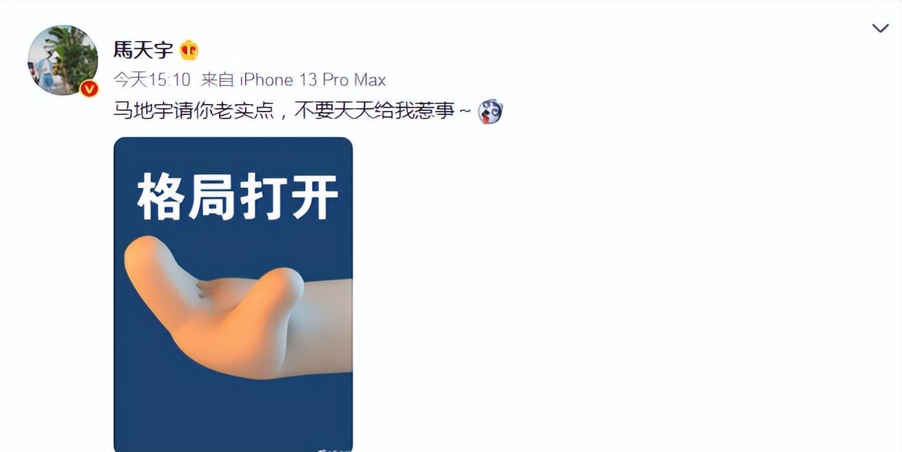 而在這件事情一個小時后,馬天宇也是再次更新自己的動態(tài),并配文稱:“馬地宇請你老實(shí)點(diǎn),不要天天給我惹事~”還配上了一個狗頭的表情包,甚至還配上了格局打開的圖片,看來是在內(nèi)涵某些人呀!