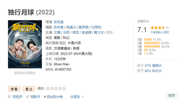 7月31日,院線電影《獨行月球》上映第3日。該片在豆瓣電影的影迷評分,也出現了三連降的局面。上映首日,該片開出7.3分的成績,次日,影迷評分下降至7.2分,上映第3日,影迷評分再次下降到了7.1分。