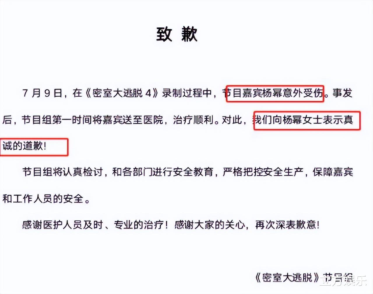 楊冪在錄制芒果臺綜藝《密室大逃脫》的時候不小心受傷,還傷到了眼角,雖然當時節目組馬上安排楊冪就醫,但是還是掩蓋不了節目組的責任問題。楊冪在處理好傷口之后,接連幾次被拍到,眼角都包有紗布,看起來應該傷得不輕。很有可能留下傷疤,對于女演員來說,留疤是最不能接受的事情,畢竟女演員們都是憑借著美貌吃飯的。