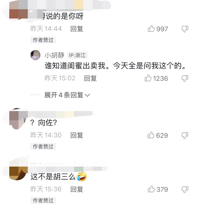 在她的身份暴露后,很多網友來到她身邊詢問她與項佐的關系。本來以為“小胡靜”會裝聾作啞,沒想到她經?;貜途W友留言,坦言:“誰會想到我的好朋友背叛我?”她還點贊了這些叫她小三的評論,默認了他們的關系。這類騷操作真的讓人不能理解。