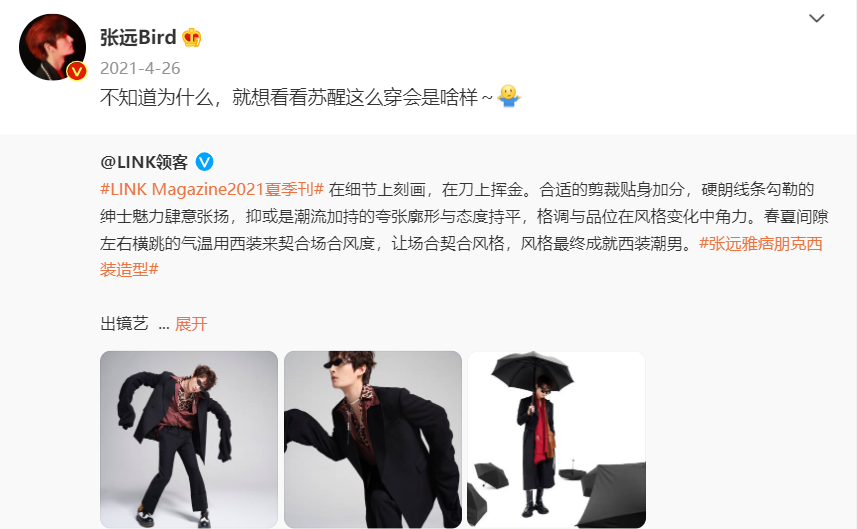 就連自己拍雜志都要說一句:突然想看看蘇醒這么穿會是啥樣。