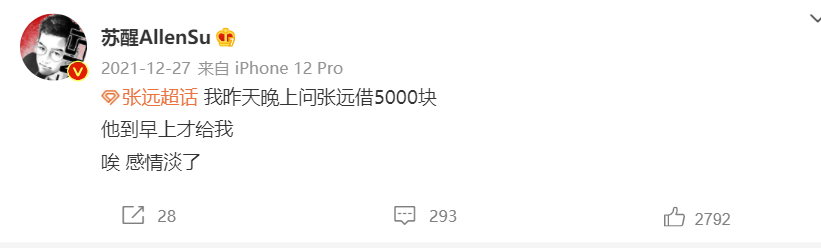 殊不知,這倆人好到就差把錢打到一個人賬戶里了。張遠的微博日常:工作和蘇醒。