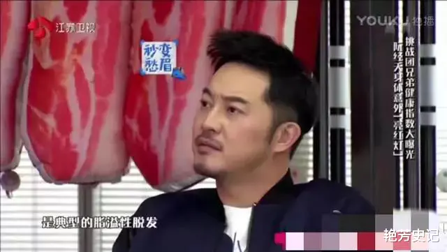 在某個節目中,他的頭發好稀疏,頭頂禿了一塊,開始往地中海發型方向發展了。