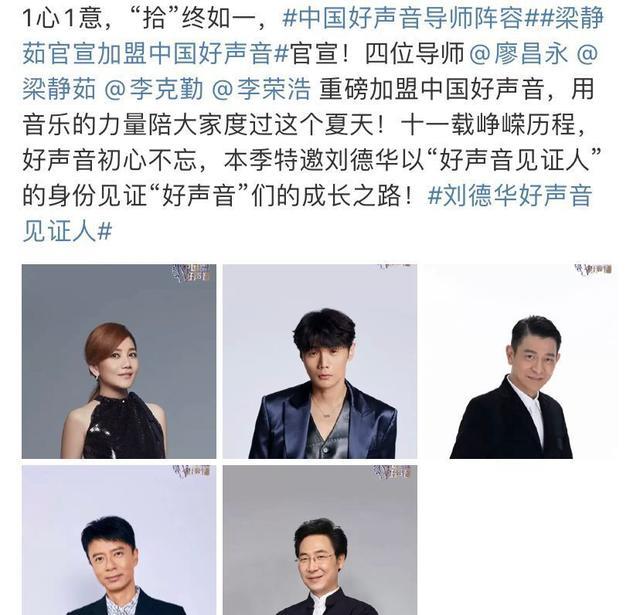 這四位導師分別是:廖昌永、梁靜茹、李榮浩、李克勤,巨星見證人是劉德華。由此可見,節目組也在努力爭取更多的收視率。研究出來加了4位小導師不溫不火,于是請來了劉德華作為好聲音見證人。
