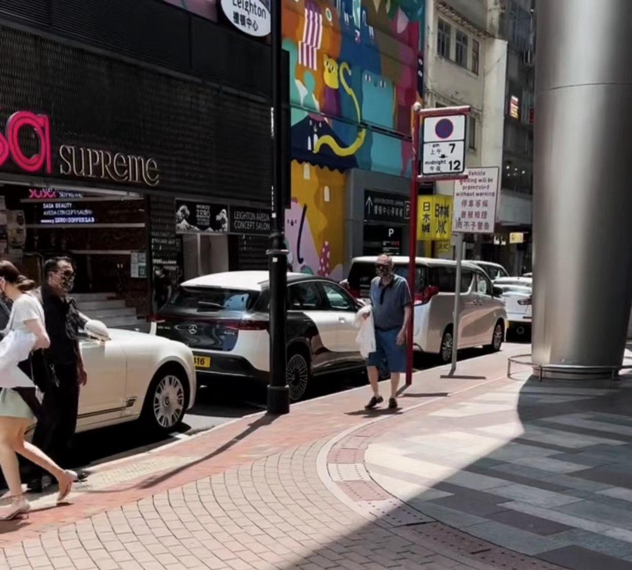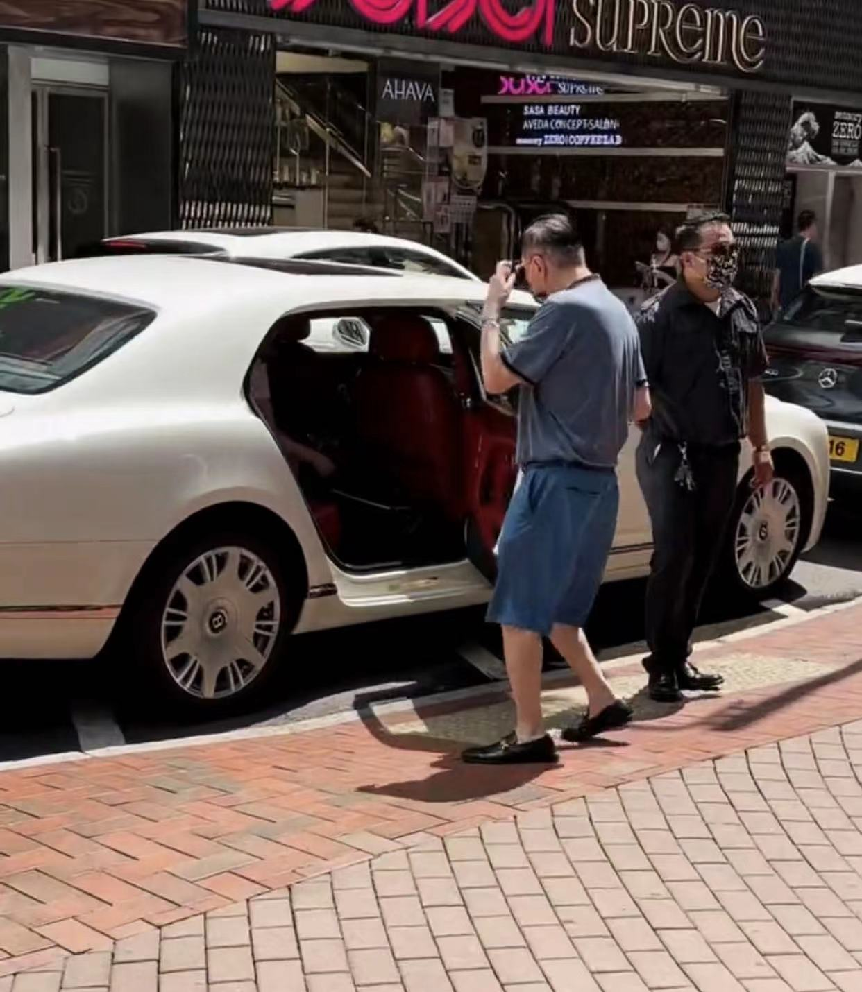待兩人坐穩后,黑衣男子朝四周張望了一下,并關上后座車門,然后也坐進了副駕駛。沒過多久,這輛豪車便載著一行人離開了香港利舞臺廣場。