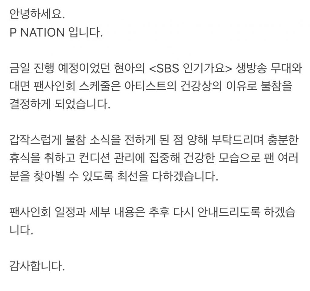 泫雅所屬經(jīng)紀(jì)公司P Nation稍早前發(fā)布官方聲明,宣布泫雅原定于24日的音樂節(jié)目《人氣歌謠》直播舞臺(tái)和粉絲簽名會(huì)都將取消,「因藝人的健康因素而突然傳達(dá)了不參與的消息,希望大家能給予諒解」。聲明強(qiáng)調(diào),泫雅將在休養(yǎng)期間集中精力管理狀態(tài),也將盡全力以健康的面貌和粉絲們見面,至于粉絲簽名會(huì)延后的日期和詳細(xì)內(nèi)容之后會(huì)再公布。