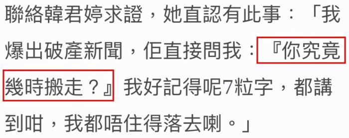 韓毫無保留地對媒體說,她和蔡已經是20年的朋友了。蔡不愿意搬家,但得知韓破產后,蔡問韓:“你到底什么時候搬出去?”