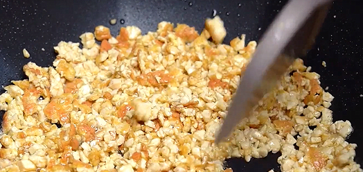 焯好水之后,我們就可以把它放入到冷水里面過(guò)涼。然后就可以放在一旁備用了,如果有條件的話也可以準(zhǔn)備一些豆腐豆腐,先把它切成片狀,然后再把它切成大小均勻的丁狀,最好選擇的是老豆腐,因?yàn)槔隙垢云饋?lái)口感會(huì)更好,然后再往豆腐里面磕入一個(gè)雞蛋,均勻的和豆腐攪拌在一起,這樣就可以把豆腐雞蛋直接扔入鍋中進(jìn)行煎了,煎到微黃的時(shí)候就可以把它抖散,再放入一些胡蘿卜。