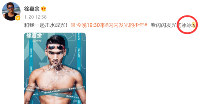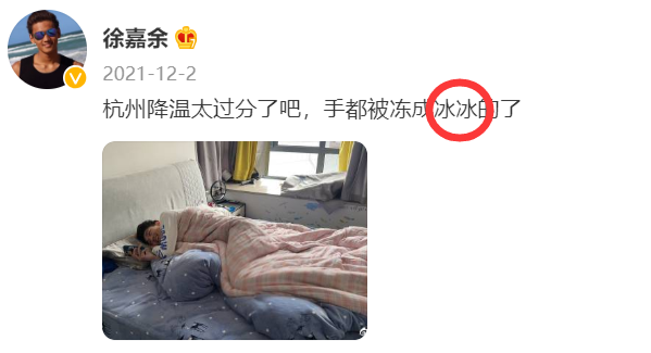 去年12月,徐嘉余直言“杭州降溫太過分了,手都凍成冰冰的了。”以及今年1月份也曾兩次提到“冰冰”,顯而易見,“冰冰”的這兩個(gè)字在徐嘉余的賬號(hào)中出現(xiàn)的頻率很高,很難不讓人懷疑是不是就是故意的,畢竟王冰冰的名字中就有“冰冰二字”,這樣一來,徐嘉余朋友圈簽名上的冰冰也就對(duì)上號(hào)了。