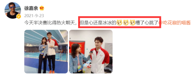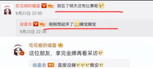 在比賽期間,王冰冰與徐嘉余也經(jīng)常互動(dòng)留言,王冰冰提醒徐嘉余不要忘記還要比賽,還要他拿完金牌再看采訪,每次留言徐嘉余都會(huì)回復(fù),還互道晚安。兩人還互相關(guān)心工作情況,聊天的內(nèi)容比較隨意自然。