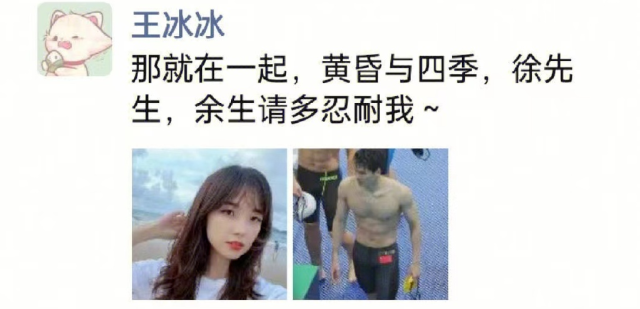 7月20日,有網(wǎng)友爆料一張朋友圈的截圖,疑似央視記者王冰冰與游泳運(yùn)動(dòng)員徐嘉余官宣戀情,配文寫道“那就在一起,黃昏與四季,徐先生,余生請(qǐng)多忍耐我。”