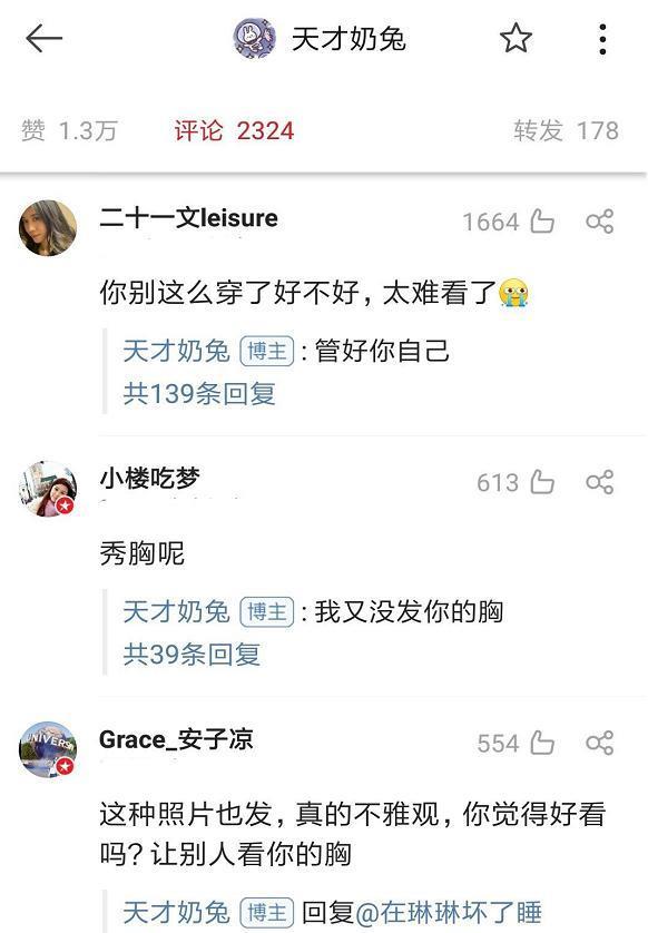 網(wǎng)絡名人“天才奶兔”因為一張照片而被指責穿著不當。有人指責她不自愛,也有人說她只是想找個男人。事實上,照片本身并沒有什么問題,天才奶兔的衣服風格幾乎是一樣的。