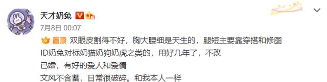我認為真相解釋清楚了,矛盾自然消失了。誰知天才奶兔卻說自己被針對了,不僅有人指責她雙眼皮是割的,就連網(wǎng)名都遭到嘲諷。她只是喜歡小動物,難道也不可以嗎?